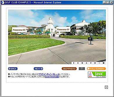 | 操作 | ●QuickTime 5以降が必用です。QuickTimeは無償でダウンロードして頂けます。 ●画面を上下左右にドラッグして下さい。 マルチノードパノラマの場合、パノラマ画面内に表示されるホットスポットをクリックすると、次のパノラマにジャンプします。 ●インストールマニュアルはこちら |